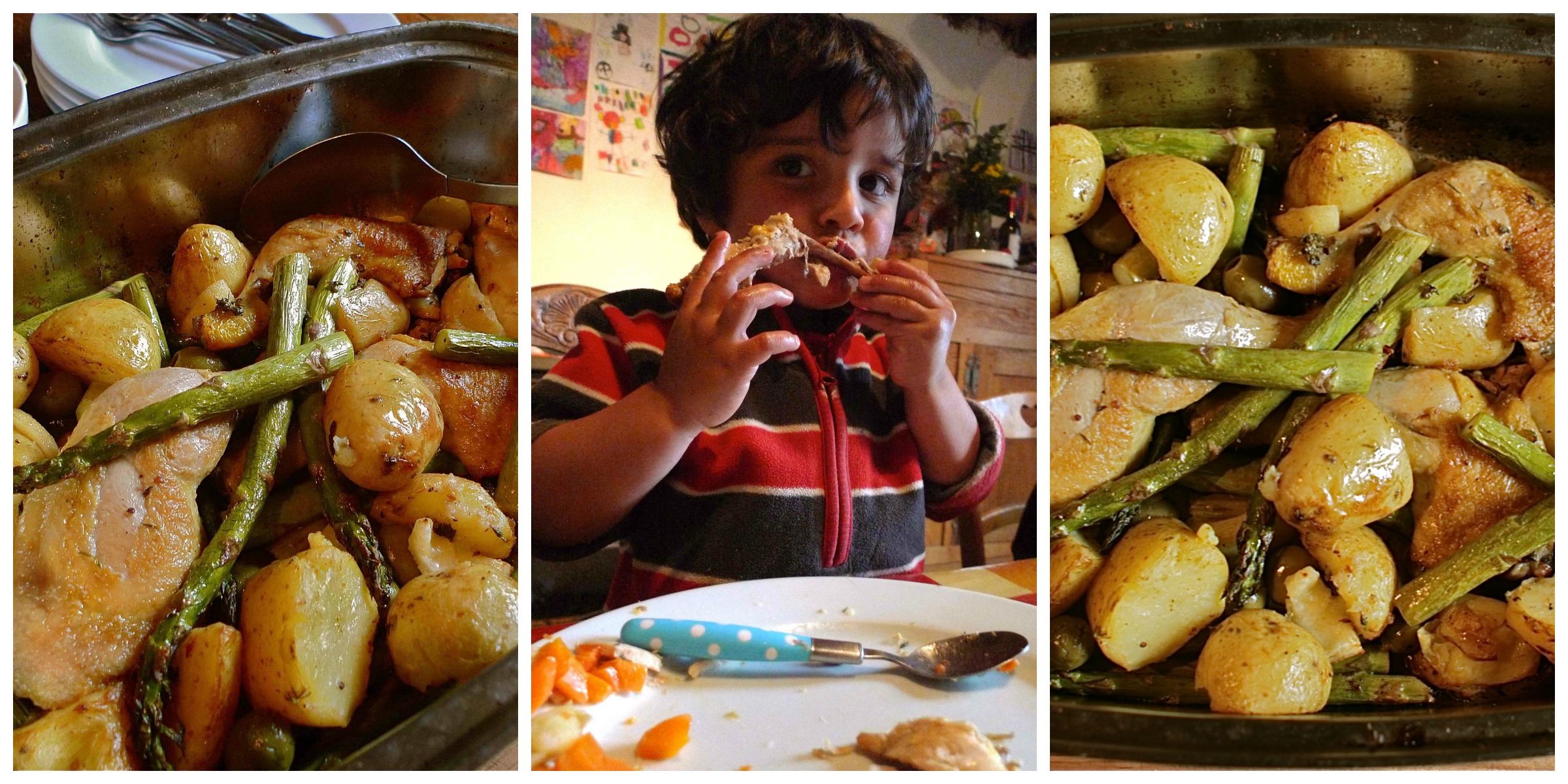 And this particular one’s most definitely my Traybake du Jour, with asparagus suddenly appearing at more reasonable end of season prices. Simply chicken pieces, new potatoes and asparagus all roasted together in a yumminess of lemon, garlic, fresh thyme and green olives. Since Jacques has recently acquired a taste for olives (bordering screaming obsession!) I seem to be adding them to everything these days; luckily his olive adverse big sister’s quite happy to pick them out and pass them over his way. And if you’ve never tried asparagus roasted with such heady flavours believe me you’re missing out. Divine. And always a bit of fight as to who gets the last spear….
