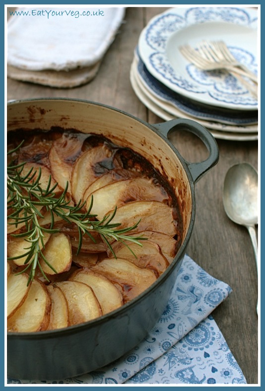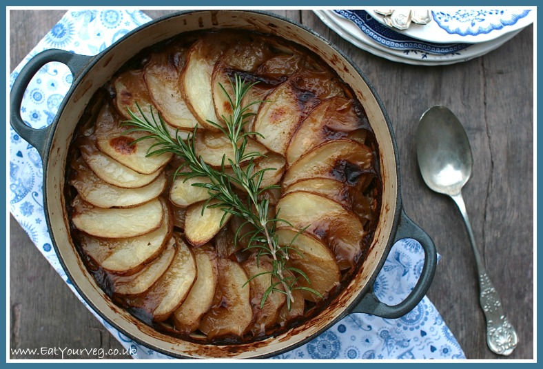 10) After an hour remove the lid and place back in the oven for a further 45 minutes until the potatoes are very tender and slightly browned.