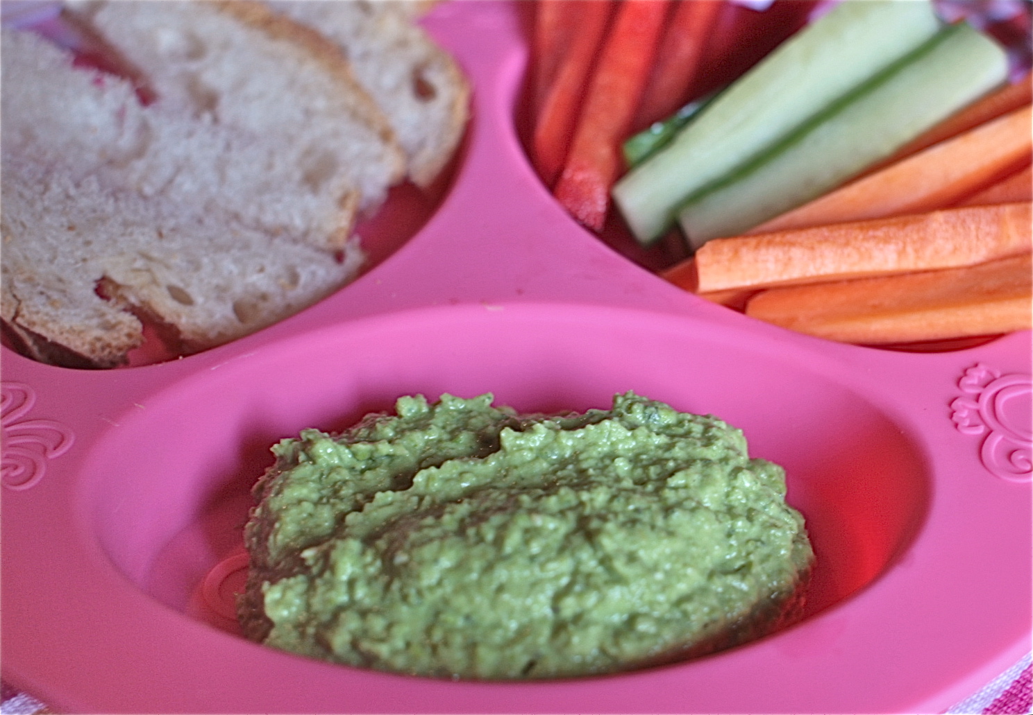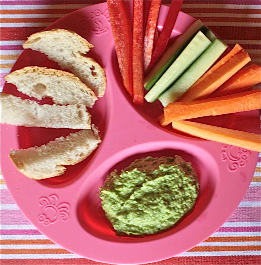 And this is a goodie of a dip, and could even be made from store cupboard ingreds. Simply peas (fresh or frozen) whizzed up with feta, lemon zest & juice, fresh mint and a little olive oil and black pepper. Very very tasty. And met with 50% approval from the kids. Jacques wolfed it down, and Francesca reluctantly tried after several minutes of complaining that she didn’t like ‘green sauce’ (meaning pesto which she has a weird and inexplicable fear of!) and ate some. Not too bad a result. And I’ll be happily polishing off the rest for my own dinner of dips and sticks later. Though possibly with wine.