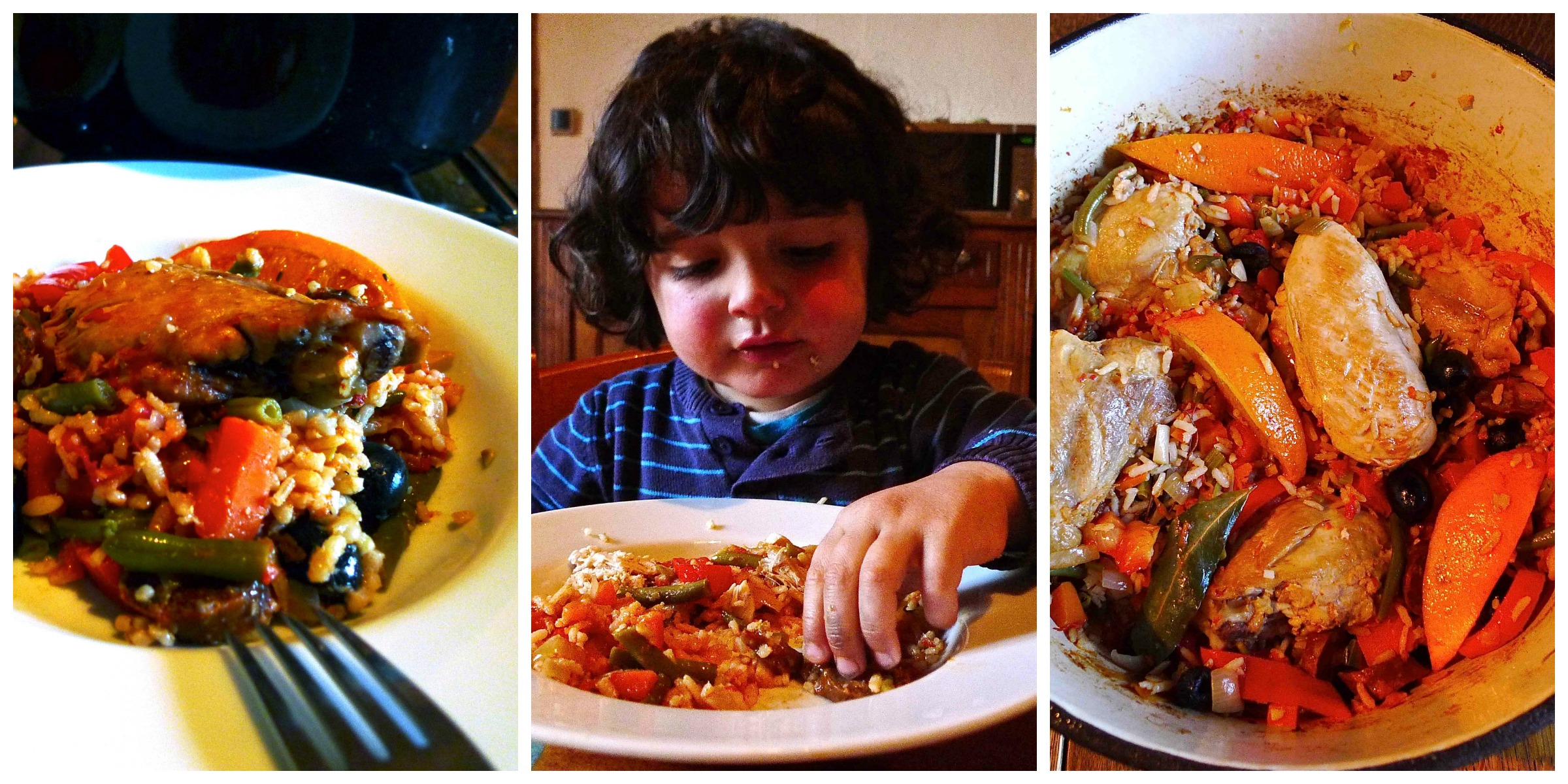 Spanish Chicken CollageI can’t believe I’ve been blogging for nearly a year and a half and this firm family favourite of weekend dinners has thus far failed to make an appearance. It’s a recipe I originally stole from my Mum, who stole from Delia, that’s chopped and changed dramatically over the years and probably bares little resemblance to it’s original form. Changed to make it quicker, easier and more suitable family fodder, and it never disappoints my lot. It’s a cheap and frugal dish (the one pot usually stretching to at least two dinners), flavoursome (think smoked paprika, chorizo, orange, olives), wholesome (brown rice and a barrage of veggies), hearty and substantial. And can handily be partly or wholly made in advance. Perfect for a weekend lunch or dinner and the tasty leftovers re-heated for a quickie dinner in the week, or even eaten cold for lunch. And my kids LOVE it, Jacques devours it. But then they are fiends for anything rice these days. If your monsters are veggie adverse like mine it’s a handy dish to hide a multitude of the good stuff, just chop them unidentifiably small!.