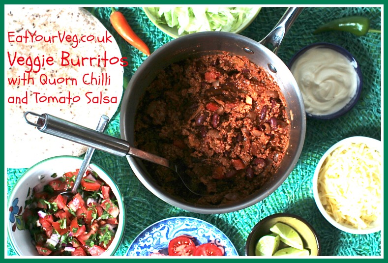 Following on from my last recipe, Roasted Veggie Pasta Bake, and to kick off National Vegetarian Week which begins in the UK today I give you my Veggie Burritos. A simple chilli con carne recipe only without the ‘carne’ and made with Quorn mince. Deliciously eaten piled into a burrito wrap with zingy tomato salsa, grated cheese, avocado slices or guacamole and a dollop sour cream, maybe even a little shredded lettuce and sliced tomato too. Oh they’re good, and note the plural there. One is just not enough. A fun and healthy hands-on dinner for all the family to messily tuck into and enjoy together.